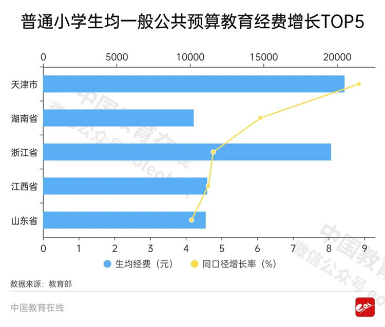 全國普通小學(xué)為12380.73元,同口徑比上年增長2.22%。各省區(qū)市中,增長最快的是天津市(8.85%)。其次為湖南省(6.09%)、浙江省(4.77%)、江西省(4.63%)、山東省(4.16%)。