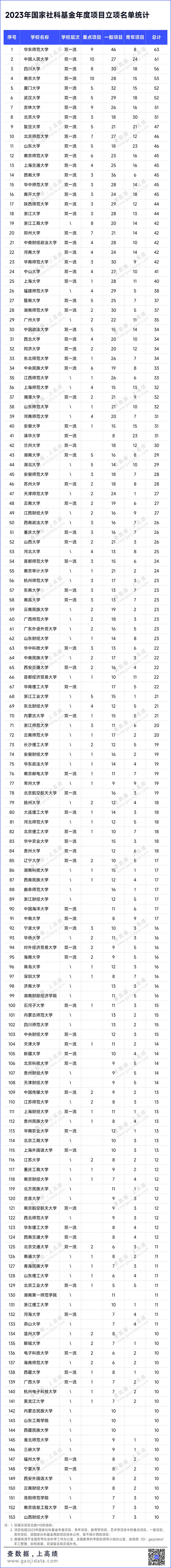 國(guó)家社科基金項(xiàng)目是目前我國(guó)唯一的國(guó)家級(jí)人文社科類研究項(xiàng)目,代表了人文社會(huì)科學(xué)的國(guó)家水準(zhǔn),是衡量一個(gè)單位科研生產(chǎn)力的重要指標(biāo)。下面匯總了2023年國(guó)家社科基金年度項(xiàng)目、青年項(xiàng)目和教育學(xué)、藝術(shù)學(xué)兩個(gè)單列學(xué)科項(xiàng)目,一起來(lái)看看誰(shuí)是人文社科領(lǐng)域的領(lǐng)頭羊。