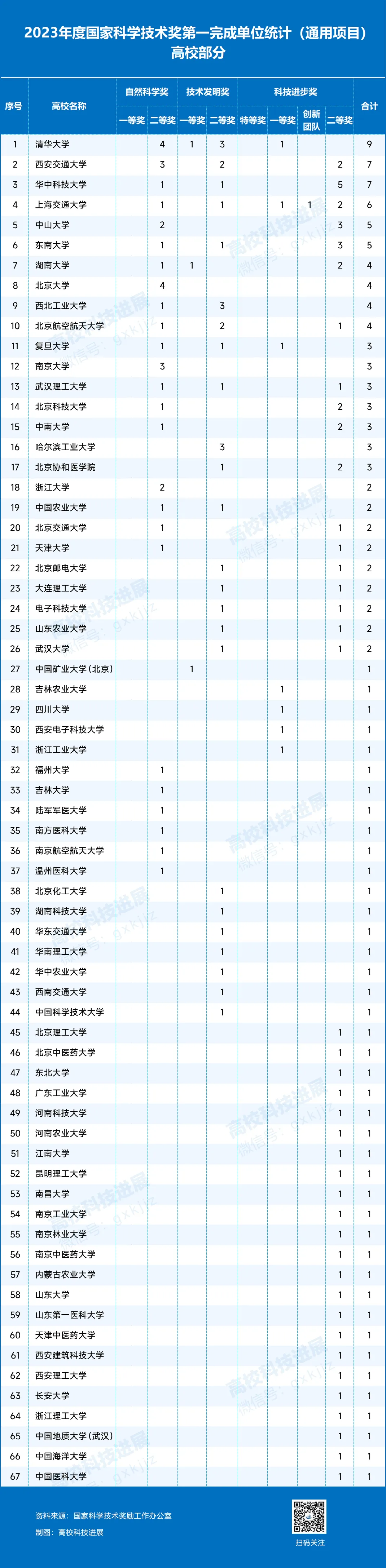 據(jù)統(tǒng)計,在通用項目中,以高校為第一完成單位(含高校醫(yī)學院/部、附屬醫(yī)院、研究所等直屬機構)的通用項目共計134項。國家自然科學獎項目中,清華大學、北京大學均有4項獲評二等獎,西安交通大學、南京大學均有3項獲評二等獎;國家技術發(fā)明獎項目中,清華大學、湖南大學、中國礦業(yè)大學(北京)各有1項獲評一等獎;國家科學技術進步獎項目中,清華大學、上海交通大學、復旦大學、吉林農(nóng)業(yè)大學、四川大學、西安電子科技大學、浙江工業(yè)大學各有1項獲評一等獎。