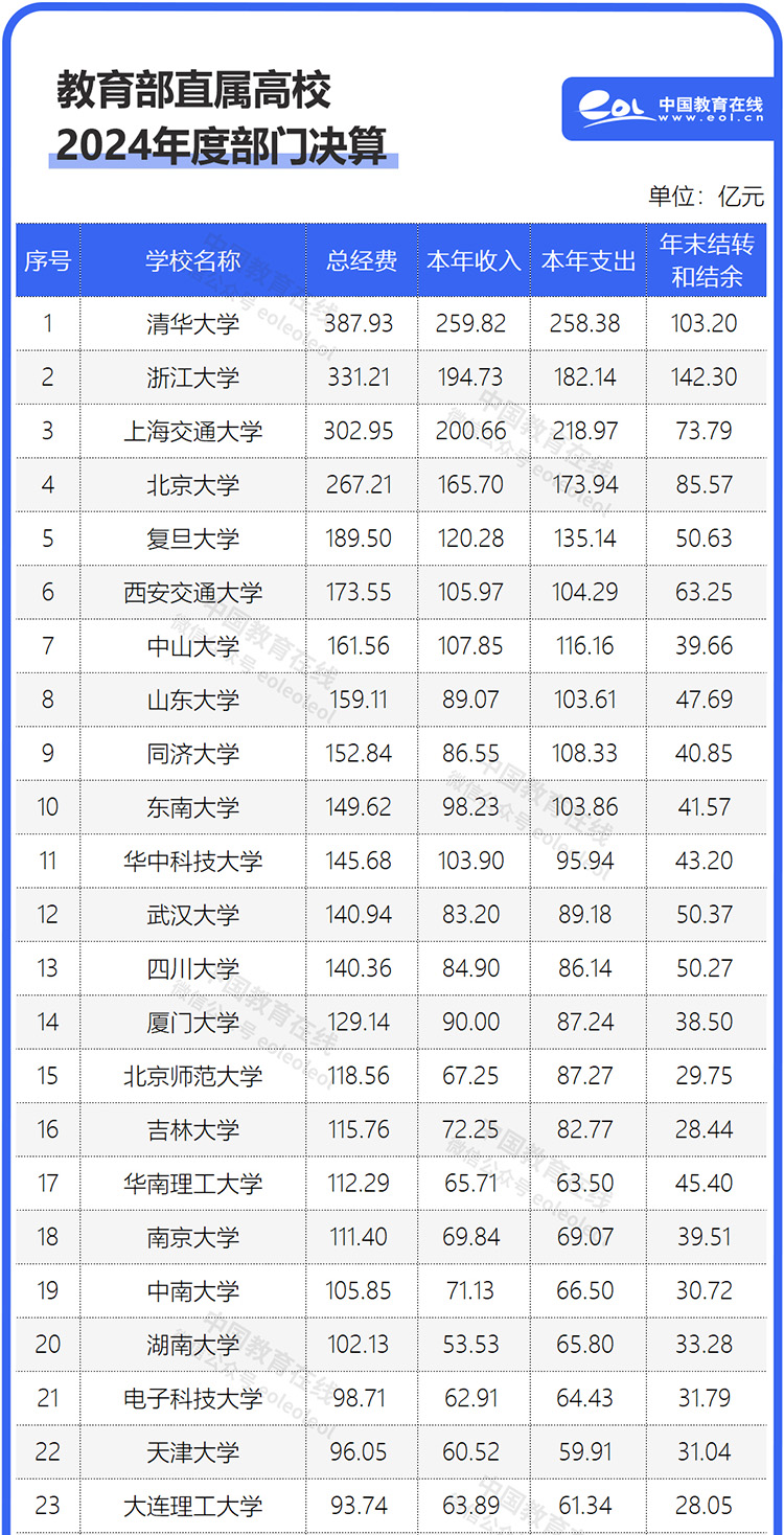 日前,75所教育部直屬高校官網(wǎng)均已公布2024年部門決算。據(jù)數(shù)據(jù)顯示,共有20所高??偨?jīng)費(fèi)過(guò)百億。