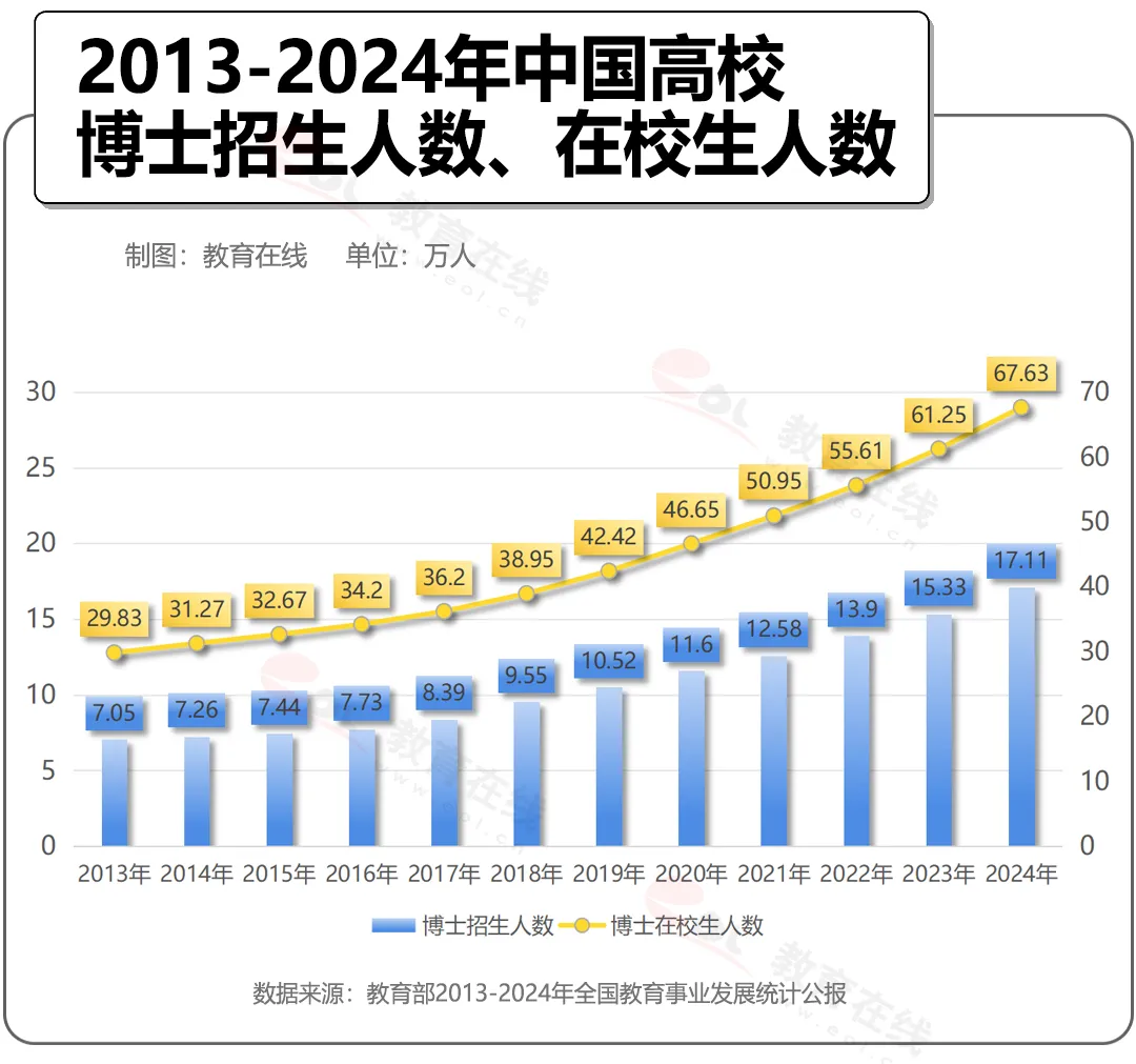 據(jù)教育部發(fā)布的數(shù)據(jù)顯示,2013—2024年間,博士年招生規(guī)模從7.05萬(wàn)人增長(zhǎng)至17.11萬(wàn)人,增幅約142%;在校博士生人數(shù)則從29.83萬(wàn)人增長(zhǎng)至67.63萬(wàn)人,增幅約127%。