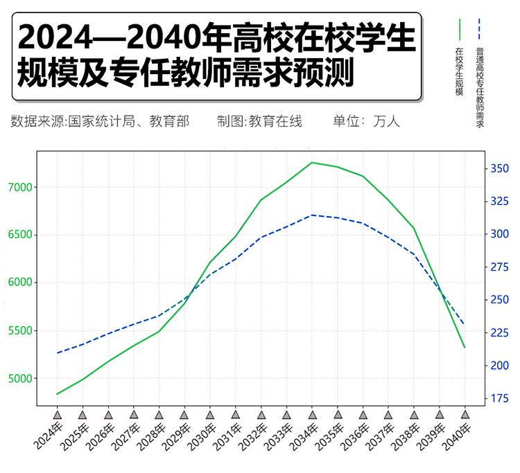 結(jié)果顯示,2034年普通高校專任教師需求將達到314萬人。相比2023年的206萬人,未來十年理論上需要新增約108萬教師。