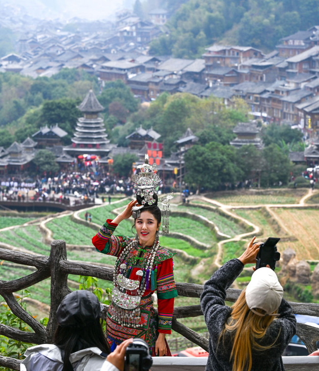 游客在貴州省黎平縣肇興侗寨觀景臺(tái)留影(2025年12月20日攝)。(新華社記者 楊文斌/攝)