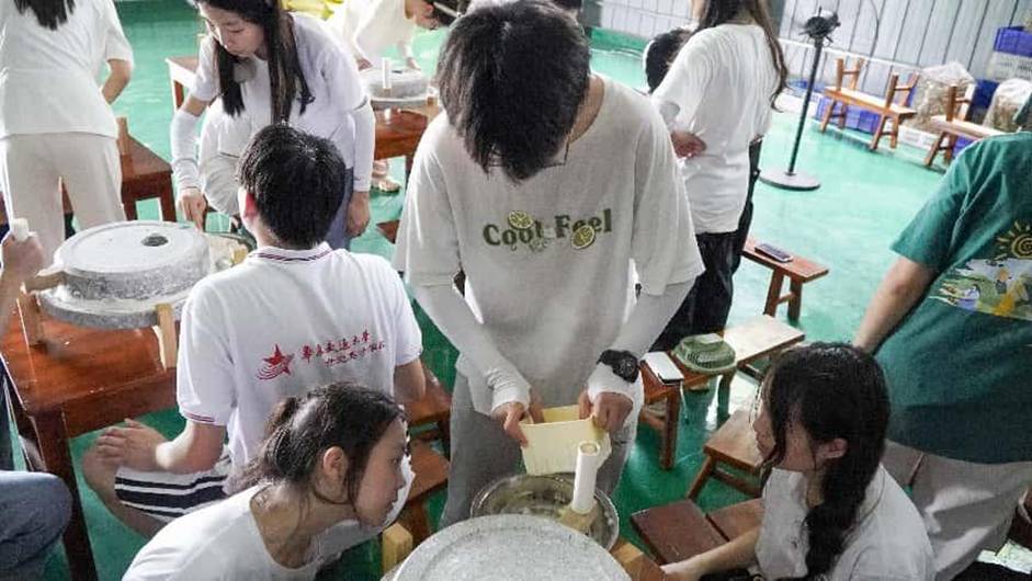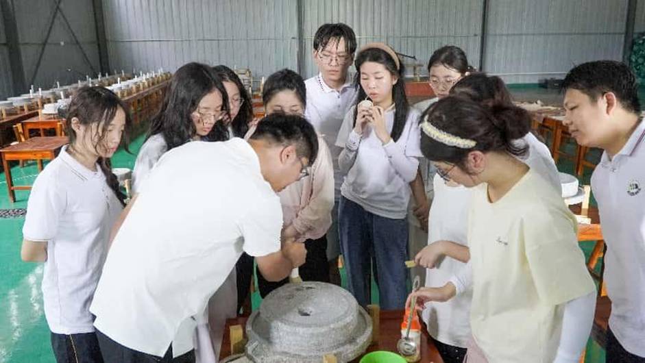 結(jié)束田間勞作后,實踐隊一行走進當?shù)貍鹘y(tǒng)豆?jié){作坊。在作坊宋師傅的帶領(lǐng)下,隊員們開啟石磨豆?jié){傳統(tǒng)工藝體驗之旅。宋師傅結(jié)合多年經(jīng)驗,細致講解水豆配比、推磨力度與節(jié)奏等核心技藝。隊員們親手推磨實踐,在一圈圈轉(zhuǎn)動中深切體會傳統(tǒng)工藝的匠心傳承與勞作辛勞,真切感受鄉(xiāng)土文 化的深厚積淀。