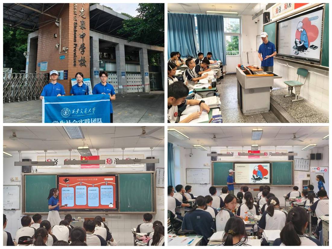 健康科普燃星火,高中宣講種希望。當(dāng)醫(yī)學(xué)科普知識在高中課堂“落地生花”,會碰撞出怎樣的火花?7月22日下午,實踐團(tuán)隊前往成都市龍泉中學(xué),在高中課堂上,圍繞青少年健康核心議題,隊員晉書香從高中生視角分享科學(xué)體重管理策略,隊員熊禹介紹了心理壓力識別與舒緩、視力保護(hù)實用技巧,一場干貨滿滿又趣味盎然的宣講,點(diǎn)燃了學(xué)子們的關(guān)于健康知識求知熱情。隊員劉秋正進(jìn)行了簡單的西安交通大學(xué)招生宣講,課堂氣氛活躍,互動熱烈。宣講尾聲,隊員組織學(xué)生們填寫了高中學(xué)生飲食習(xí)慣與健康影響因素問卷,既為實踐隊后續(xù)調(diào)研夯實數(shù)據(jù)基礎(chǔ),也實時檢驗了宣講效果,收集到寶貴的教學(xué)反饋。