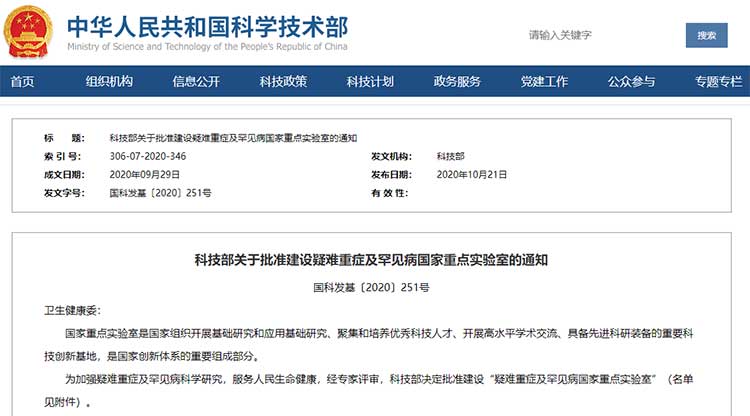 科技部關(guān)于批準(zhǔn)建設(shè)疑難重癥及罕見病國家重點實驗室的通知