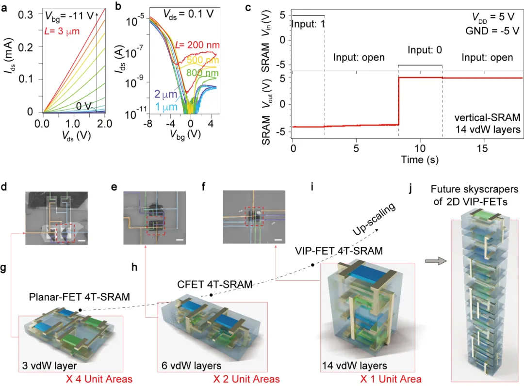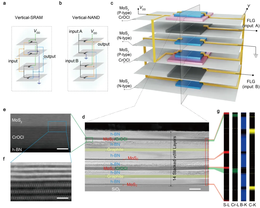 在此基礎(chǔ)上,該研究團(tuán)隊(duì)利用垂直堆疊的方式制備了由14層范德華材料組成、包含4個(gè)晶體管的互補(bǔ)型邏輯門NAND以及SRAM等器件(如圖1所示)。