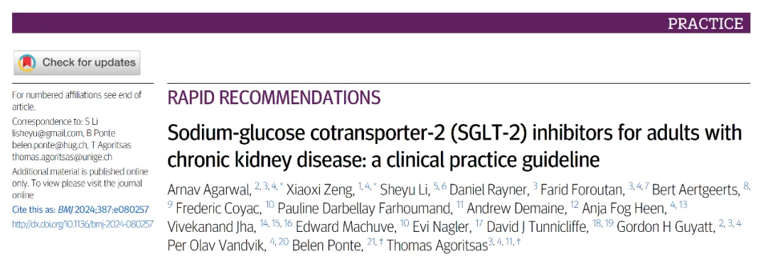 近日,四川大學(xué)華西醫(yī)院腎臟內(nèi)科/生物醫(yī)學(xué)大數(shù)據(jù)研究院曾筱茜副教授、內(nèi)分泌代謝科李舍予副教授,聯(lián)合9個國家的腎臟科、普通內(nèi)科、內(nèi)分泌科、全科醫(yī)學(xué)科等15名臨床醫(yī)生、循證醫(yī)學(xué)方法學(xué)家以及3名慢性腎病患者,共同制定的《鈉-葡萄糖共轉(zhuǎn)運(yùn)蛋白2(SGLT2)抑制劑治療成人慢性腎臟病(CKD)臨床實(shí)踐指南》,在“臨床醫(yī)學(xué)四大刊”之一的BMJ發(fā)表。