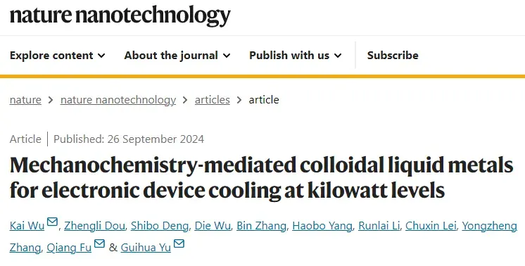 近日,四川大學(xué)高分子科學(xué)與工程學(xué)院傅強(qiáng)教授/吳凱副研究員團(tuán)隊(duì)聯(lián)合美國德克薩斯大學(xué)奧斯汀分校,開發(fā)出了一種新型熱界面材料一一膠體狀液態(tài)金屬,以應(yīng)對這一挑戰(zhàn)。他們通過機(jī)械化學(xué)的方法制備了一種液態(tài)金屬/氮化鋁膠體,該材料表現(xiàn)出卓越的導(dǎo)熱性能和觸變性,顯著降低了固-固界面的熱阻,縮小了現(xiàn)有TIMs與理論之間的差距。經(jīng)測試,這種膠體的熱阻僅為0.42-0.86mm2K/W,遠(yuǎn)超當(dāng)前領(lǐng)先的導(dǎo)熱材料的性能。在結(jié)合微通道冷卻系統(tǒng)的測試中,這種膠體能夠從16平方厘米的熱源中提取2760瓦的熱量,同等條件下相比最先進(jìn)的硅脂可以減少65%的泵電力消耗,為千瓦級設(shè)備的可持續(xù)冷卻提供了新方案。這一研究成果以“Mechanochemistry-mediated colloidal liquid metals for electronic device cooling at kilowatt levels"為題,發(fā)表在《Nature Nanotechnology》期刊上。吳凱副研究員(德克薩斯大學(xué)奧斯汀分校訪學(xué)者),博士生竇正力、鄧世博為共同第一作者,吳凱副研究員、傅強(qiáng)教授和德克薩斯大學(xué)奧斯汀分校余桂華教授為共同通訊作者。