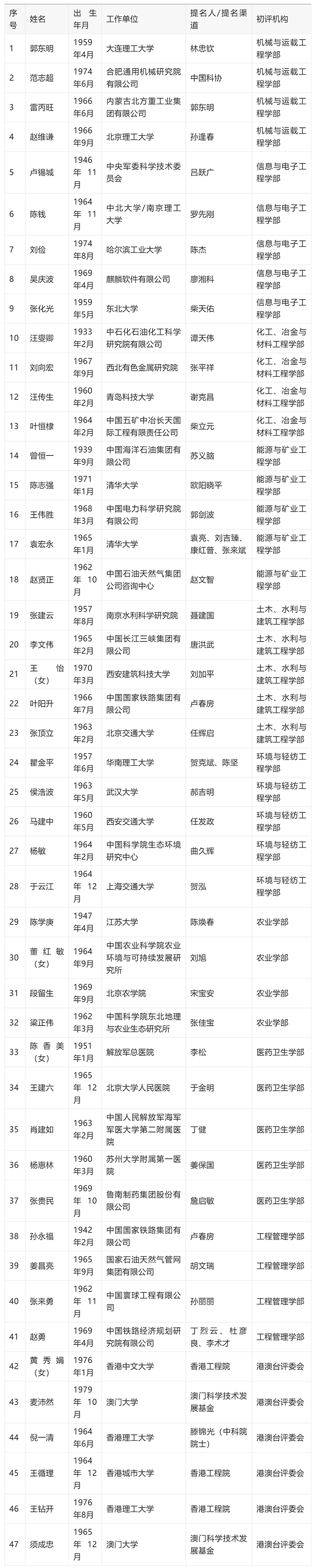 第十六屆光華工程科技獎初評工作已經(jīng)結(jié)束。經(jīng)初評,共產(chǎn)生47位候選人進(jìn)入終評,根據(jù)《光華工程科技獎管理辦法》,現(xiàn)將通過初評的候選人名單予以公布。