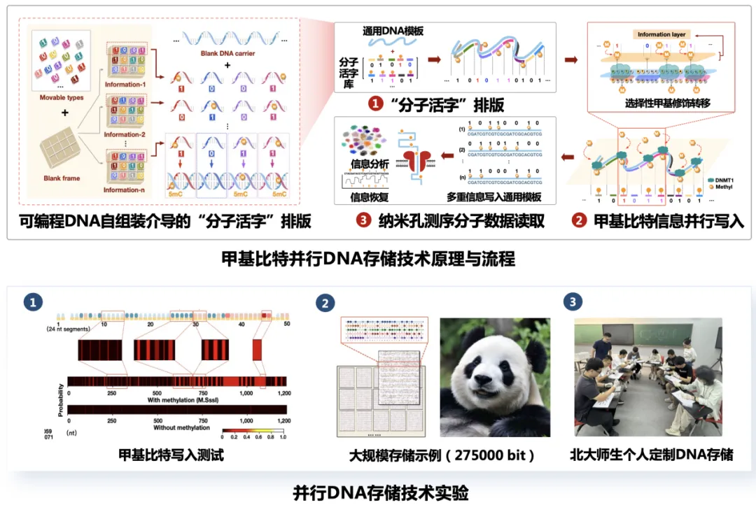 2024年10月23日,北京大學(xué)計算機學(xué)院張成與定量生物學(xué)中心錢瓏聯(lián)合研究團隊與合作者,在國際學(xué)術(shù)期刊Nature上發(fā)表題為“Parallel molecular data storage by printing epigenetic bits on DNA”的研究論文,首次提出了一種基于并行寫入策略的DNA存儲策略,成功將信息打印在DNA分子之上,猶如“活字印刷”,在白紙上批量印刷信息。團隊在實驗中,成功將中國漢代“白虎”瓦當(dāng)和大熊貓的高清圖片(數(shù)據(jù)量超過27.5萬比特)寫入DNA分子中,并無損還原了原始數(shù)據(jù),解析出高清圖片。
