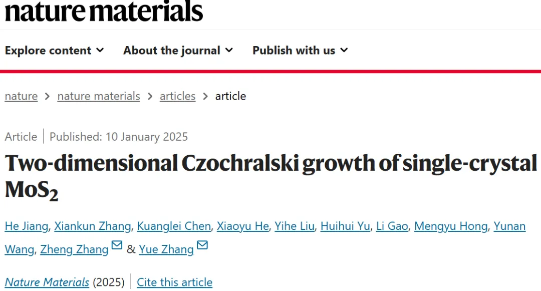 大規(guī)模生產(chǎn)高質(zhì)量的二維過渡金屬二硫族化物(TMDCs)是二維器件工業(yè)制造中的一個(gè)重大挑戰(zhàn)。張躍院士及張錚教授團(tuán)隊(duì)等人提出了一種名為“二維Czochralski(2DCZ)”的方法,該方法能夠在常壓下快速生長(zhǎng)出厘米級(jí)尺寸、無晶界的單晶MoS2晶疇,這些MoS2單晶展現(xiàn)出卓越的均勻性和高質(zhì)量,具有極低的缺陷密度。由MoS2制造的場(chǎng)效應(yīng)晶體管的統(tǒng)計(jì)分析表明,器件良率高,遷移率變化最小。這種2DCZ方法對(duì)制造高質(zhì)量和可擴(kuò)展的二維半導(dǎo)體材料和器件具有重要意義,為下一代集成電路的制造提供了重要的材料基礎(chǔ)。相關(guān)成果以“Two-dimensional Czochralski growth of single-crystal MoS2”為題于2025年1月10日發(fā)表在Nature Materials上。第一作者為姜鶴博士。
