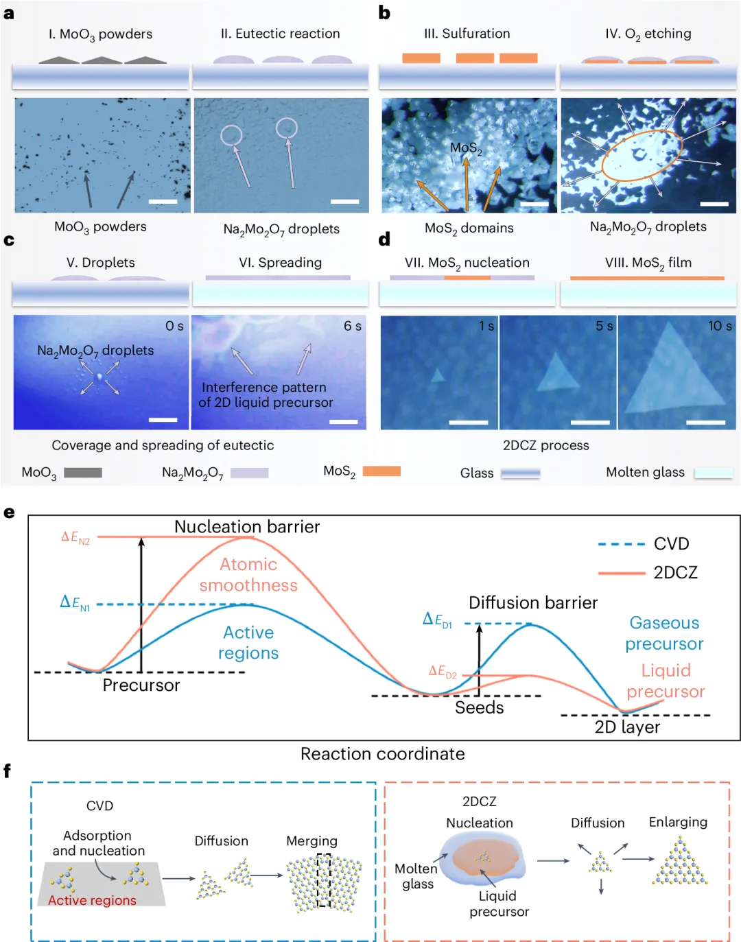 2DCZ方法的機(jī)理:2DCZ生長(zhǎng)過程中引入的液相顯著改變了反應(yīng)過程。大尺寸的MoS2晶疇是通過抑制成核勢(shì)壘和促進(jìn)擴(kuò)散勢(shì)壘而獲得的。最初,熔融玻璃呈現(xiàn)出原子級(jí)光滑和無缺陷的表面,顯著增強(qiáng)了成核勢(shì)壘。這降低了生長(zhǎng)過程中的形核密度,從而削弱了材料和襯底之間的耦合力。此外,由于液-液體系中熔融玻璃的表面張力較大,液態(tài)前驅(qū)體容易鋪展,最終在二維液膜與襯底之間形成單獨(dú)的界面。預(yù)鋪展的前驅(qū)體在襯底上的擴(kuò)散勢(shì)壘遠(yuǎn)低于通過氣相吸附-擴(kuò)散-生長(zhǎng)的CVD法,這極大地提高了生長(zhǎng)速率,達(dá)到了75μms-1。因此,超低的成核密度和超快的生長(zhǎng)速率相結(jié)合,使得MoS2從多晶向單晶轉(zhuǎn)變,實(shí)現(xiàn)了超大尺度的晶界消除