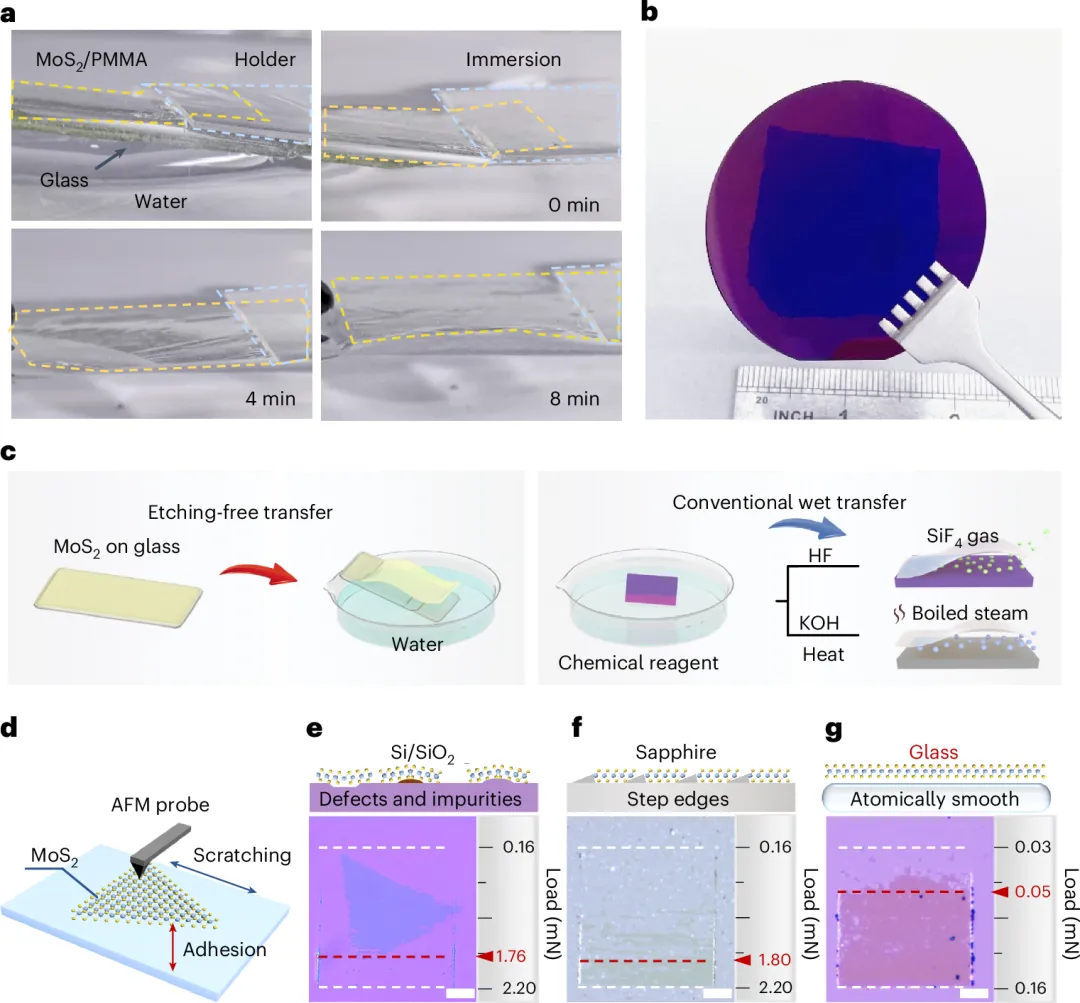 大面積MoS2薄膜的轉(zhuǎn)移:利用去離子水的表面張力,MoS2薄膜可以自發(fā)剝離,無損且高效率地成功大面積轉(zhuǎn)移到2英寸硅片上。這一方法利用薄膜和襯底見的弱界面耦合特性,無需使用任何蝕刻溶液,從而顯著減少了對(duì)化學(xué)試劑的依賴,并避免了傳統(tǒng)方法可能帶來的薄膜損傷。MoS2薄膜與襯底之間的附著力越強(qiáng),薄膜在外力作用下越難以被切開。通過AFM納米劃痕測(cè)試量化了MoS2與基材之間的附著力,結(jié)果表明2DCZ生長(zhǎng)在玻璃基板上的MoS2附著力最弱(0.05mN),顯著低于傳統(tǒng)CVD生長(zhǎng)在其他襯底如硅(1.76mN)和藍(lán)寶石(1.80mN)。這一溫和高效的轉(zhuǎn)移方法為大面積單層二維半導(dǎo)體材料的完整轉(zhuǎn)移提供了新思路,有望促進(jìn)其在集成中的應(yīng)用。