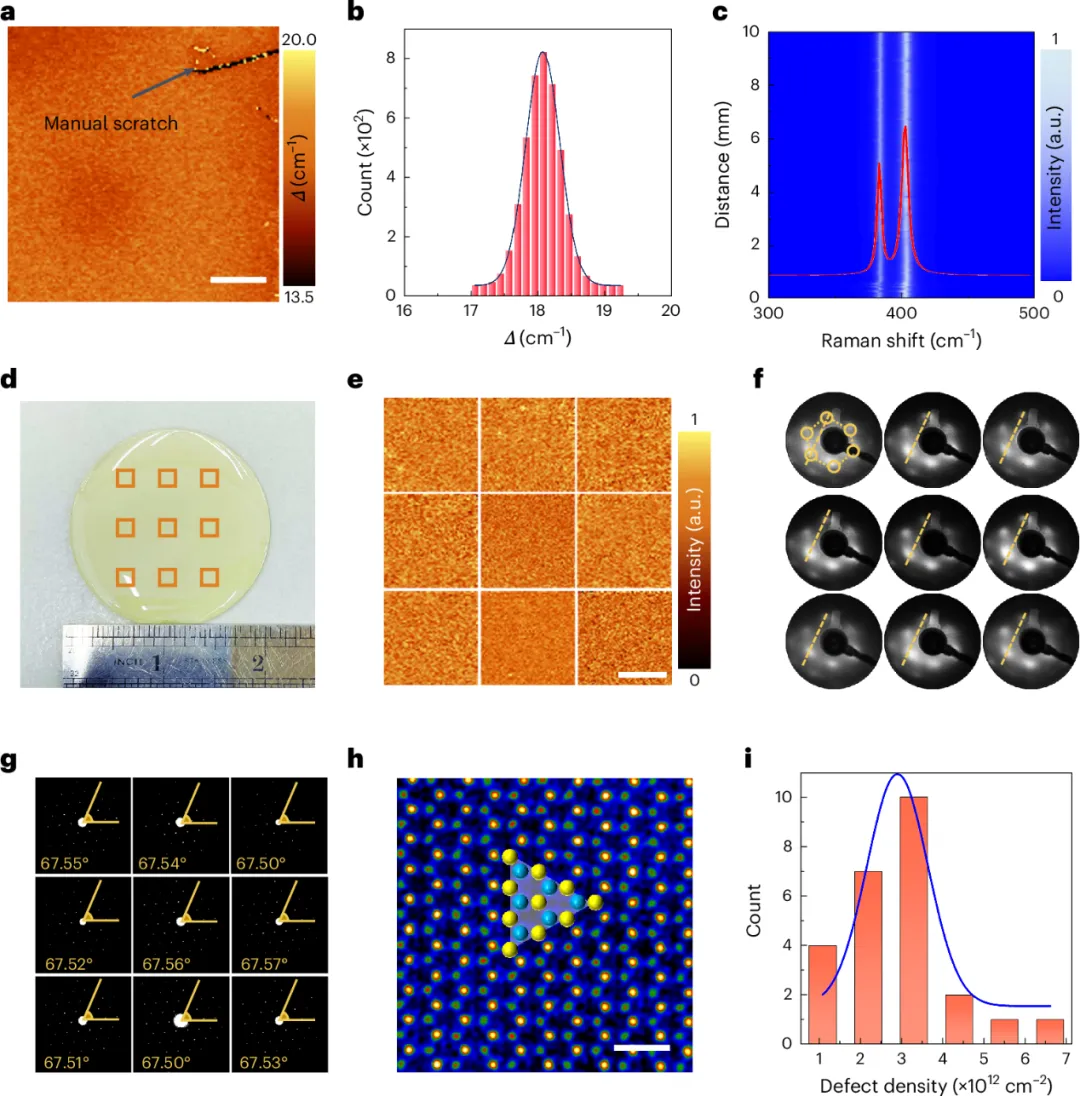 MoS2的均一性和結(jié)晶度:拉曼測(cè)試表明,2.5×2.5mm2區(qū)域內(nèi)的峰值差異極小(平均值為 18.22cm-1),低于傳統(tǒng)CVD方法,表明缺陷密度較低。低能電子衍射進(jìn)一步證實(shí)了薄膜在厘米尺度的單晶特性。掃描隧道顯微鏡的原子分辨率圖像顯示MoS2薄膜具有一致的六方晶格結(jié)構(gòu),通過統(tǒng)計(jì)得到的硫空位缺陷密度僅為2.9×1012cm-2。此外,水輔助低無損轉(zhuǎn)移過程進(jìn)一步提升了薄膜的整體質(zhì)量。與CVD相比,2DCZ的液-固結(jié)晶過程顯著增強(qiáng)了溶質(zhì)擴(kuò)散效率,確保了大面積單層MoS2的均勻性和高結(jié)晶度,使其適合應(yīng)用于大規(guī)模集成電路制造。