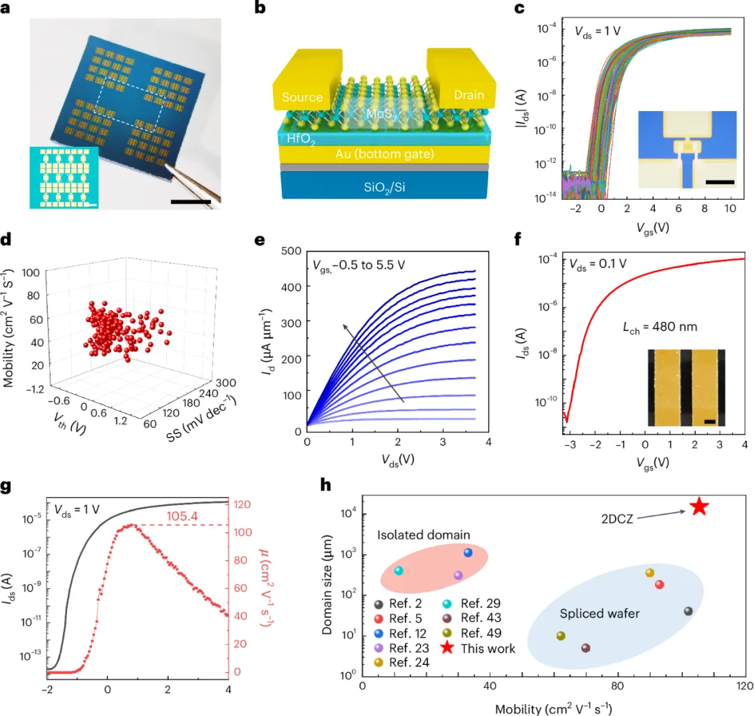 本文引入了一種固-液-固工藝,使MoS2從多晶轉(zhuǎn)變?yōu)閱尉?。首先,通過蝕刻反預(yù)沉積的多晶MoS2,在熔融玻璃基板上形成大規(guī)模的二維液體前驅(qū)體膜。然后采用超快硫化工藝在原子級(jí)光滑界面上獲得大面積的MoS2晶疇。生長(zhǎng)的MoS2晶疇尺寸為1.5cm,缺陷密度為2.9×1012cm-2。此外,低成核密度削弱了MoS2薄膜與襯底之間的附著力,有利于在去離子水的輔助下實(shí)現(xiàn)超清潔、快速和高質(zhì)量的轉(zhuǎn)移過程。場(chǎng)效應(yīng)晶體管(FET)陣列的平均遷移率為55cm2V-1s-1,變化很小,為15.9%。短溝道FET獲得了443.8μAμm-1的高飽和電流。FET的最佳遷移率為105.4cm2V-1s-1。MoS2薄膜的高質(zhì)量和均勻性使FET陣列表現(xiàn)出優(yōu)異的電學(xué)性能,從而促進(jìn)了二維半導(dǎo)體從器件到先進(jìn)集成電路的應(yīng)用。