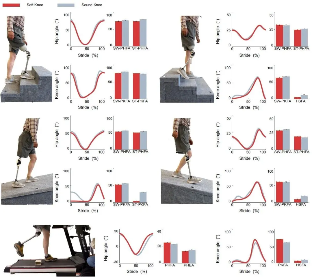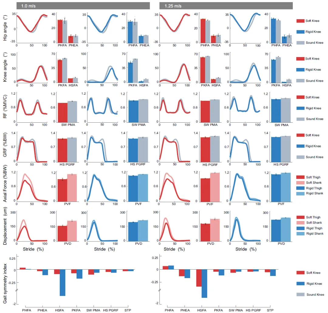 此外,本研究邀請(qǐng)三名殘疾人被試參加一系列行走實(shí)驗(yàn),如1 m/s和1.25 m/s跑步機(jī)行走、上、下15 cm臺(tái)階、上、下10°斜坡、跨越障礙等。圖6展示的是殘疾人分別穿戴軟體假肢和日常使用的剛性假肢在跑步機(jī)上以1 m/s和1.25 m/s的速度行走的實(shí)驗(yàn)結(jié)果,實(shí)驗(yàn)采集了殘疾人殘側(cè)和健側(cè)的關(guān)節(jié)角度、肌肉激活程度、足底壓力、假肢對(duì)地面沖擊力和振幅的的吸收,并進(jìn)行了步態(tài)對(duì)稱(chēng)性分析。結(jié)果表明,盡管殘疾人對(duì)軟體假肢不熟悉,仍可以穿戴軟體膝關(guān)節(jié)假肢以正常步速和較快步速進(jìn)行行走,并具有更好的步態(tài)對(duì)稱(chēng)性,殘疾人不僅更省力,受到的沖擊也更小,主觀上也認(rèn)為行走時(shí)的舒適度更高。