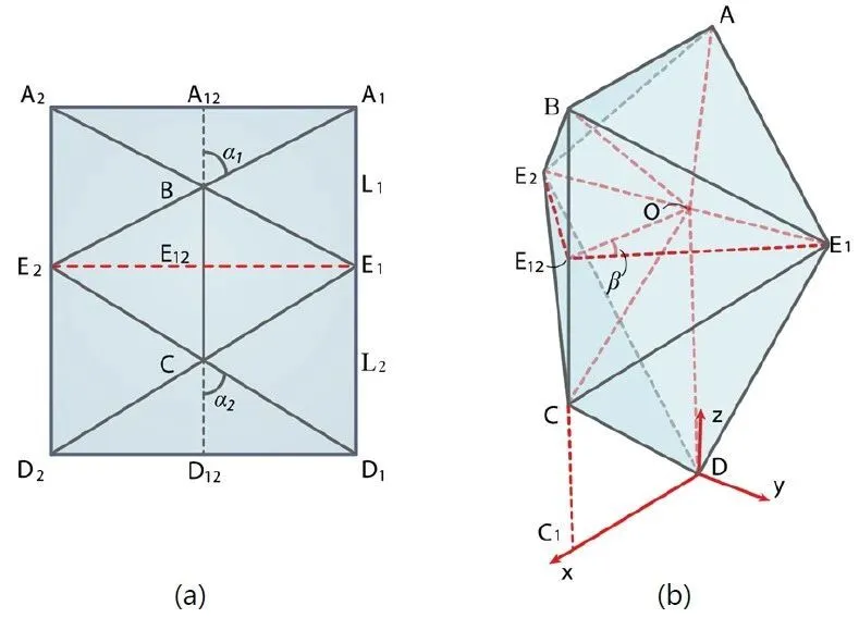 本研究提出一種具有變轉(zhuǎn)動(dòng)中心性質(zhì)的折紙結(jié)構(gòu),如圖2所示,其中虛線(xiàn)為谷線(xiàn),實(shí)線(xiàn)為山線(xiàn),紅色虛線(xiàn)為輔助線(xiàn)。沿山線(xiàn)和谷線(xiàn)折疊,并使A1B 和A2B、D1C 和D2C 分別重合,即可形成如圖2(b)所示的3D 折紙結(jié)構(gòu)。