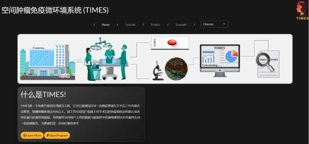 “TIMES”評(píng)分系統(tǒng)全稱(chēng)為“Tumor Immune MicroEnvironment Spatial”(腫瘤免疫微環(huán)境空間)評(píng)分系統(tǒng),是首個(gè)結(jié)合空間免疫信息的肝癌復(fù)發(fā)預(yù)測(cè)工具。研究證明了免疫細(xì)胞的空間分布比其整體數(shù)量更能決定臨床預(yù)后,將空間轉(zhuǎn)錄組學(xué)、蛋白質(zhì)組學(xué)和多光譜免疫組化技術(shù)與人工智能驅(qū)動(dòng)的空間分析整合,創(chuàng)造了腫瘤微環(huán)境評(píng)估的全新方法。