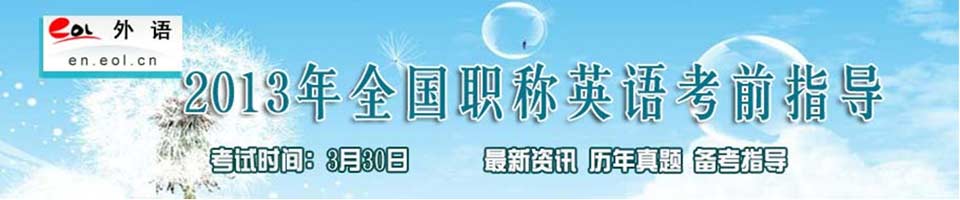 導語:3月30日,參加2013年職稱外語考試的考生就將步入考場,為幫助同學們進行最后的備考沖刺,中國教育在線外語頻道特制作了2013職稱英語考前指導專題,希望給考生們備考提供借鑒和幫助,祝大家順利通關。